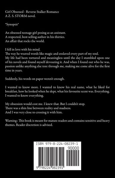 Girl Obsessed - Reverse Stalker Romance A Z. S. STORM novel published under the pen name ANA STORM *Synopsis* An obsessed teenage girl posing as an assistant. A respected, best-selling author in his thirties. An affair that rocks the world. I fell in love with his mind. The way he weaved words like magic and enslaved every part of my soul. My life had been tortured and meaningless until the day I stumbled upon one of his novels and found myself devouring it. And when I found out who he was, passion unlike anything else tore through me, making me come alive for the first time in years. Suddenly, his words on paper weren't enough. I wanted to know more. I wanted to know his real name, what he liked for breakfast, how he looked when he slept, what his favourite scent was. Everything. I wanted to know everything. My obsession would cost me. I knew that. But I couldn't stop. There was a thin line between reality and madness. And I was very close to crossing it with him. Warning : This book is meant for mature readers and contains sensitive and heavy themes. Reader discretion is advised.