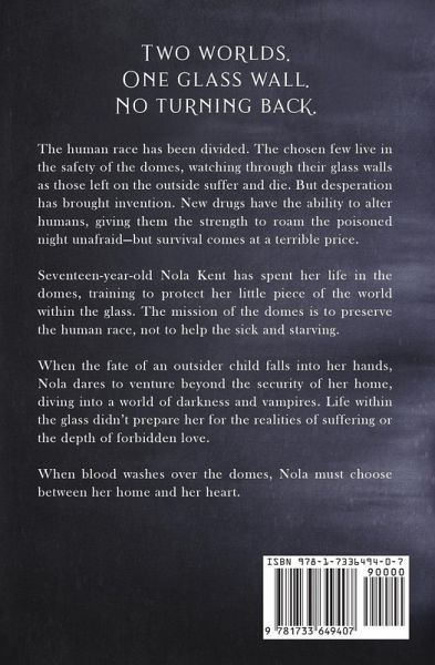 Two worlds. One glass wall. No turning back.The human race has been divided. The chosen few live in the safety of the domes, watching through their glass walls as those left on the outside suffer and die. But desperation has brought invention. New drugs have the ability to alter humans, giving them the strength to roam the poisoned night unafraid-but survival comes at a terrible price.Seventeen-year-old Nola Kent has spent her life in the domes, training to protect her little piece of the world within the glass. The mission of the domes is to preserve the human race, not to help the sick and starving.When the fate of an outsider child falls into her hands, Nola dares to venture beyond the security of her home, diving into a world of darkness and vampires. Life within the glass didn't prepare her for the realities of suffering or the depth of forbidden love.When blood washes over the domes, Nola must choose between her home and her heart. Girl of Glass is a young adult, paranormal romance series that weaves vampires and werewolves into a dystopian society, creating a post-apocalyptic, end of the world adventure. Whether you're in the mood for love triangles, a friends to lovers twist, or just crave young adult fiction books that feature girls in STEM, Girl of Glass is an apocalyptic sci-fi YA fans will love. With runaways, orphans, and science fiction feats of genetic engineering that will change your view of the apocalypse, this is a series you'll be dying to binge.