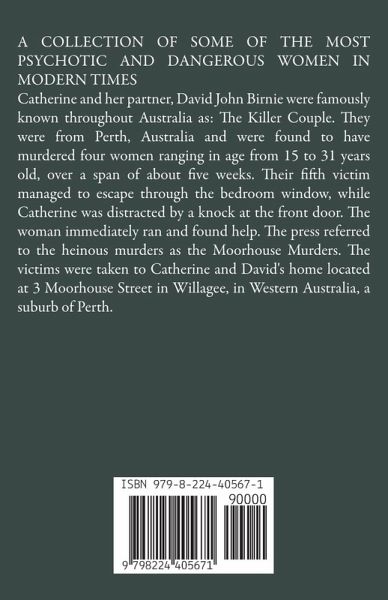 A COLLECTION OF SOME OF THE MOST PSYCHOTIC AND DANGEROUS WOMEN IN MODERN TIMES Catherine and her partner, David John Birnie were famously known throughout Australia as: The Killer Couple. They were from Perth, Australia and were found to have murdered four women ranging in age from 15 to 31 years old, over a span of about five weeks. Their fifth victim managed to escape through the bedroom window, while Catherine was distracted by a knock at the front door. The woman immediately ran and found help. The press referred to the heinous murders as the Moorhouse Murders. The victims were taken to Catherine and David's home located at 3 Moorhouse Street in Willagee, in Western Australia, a suburb of Perth.