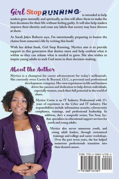 Girl Stop Running is intended to help readers grow mentally and spiritually, as this book will allow them to make the best decisions for their life without feeling guilty. It will also help readers improve their identity and erase any labels that society may have thrown at them. As Sarah Jakes Roberts says, I'm intentionally preparing to loosen the chains from someone's life by writing this book! With her debut book, Girl Stop Running, Myrtice aim is to provide support to this generation that desires more and help confirm what is within, so they can release what is needed to grow. She also wishes to inspire young adults to seek God more in their decision-making.