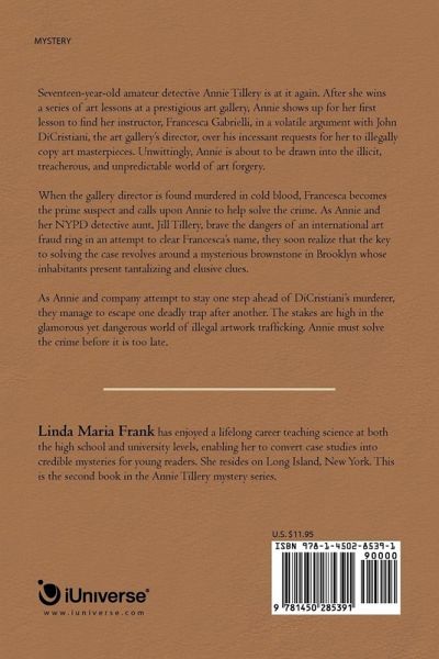 Seventeen-year-old amateur detective Annie Tillery is at it again. After she wins a series of art lessons at a prestigious art gallery, Annie shows up for her first lesson to find her instructor, Francesca Gabrielli, in a volatile argument with John DiCristiani, the art gallery's director, over his incessant requests for her to illegally copy art masterpieces. Unwittingly, Annie is about to be drawn into the illicit, treacherous, and unpredictable world of art forgery. When the gallery director is found murdered in cold blood, Francesca becomes the prime suspect and calls upon Annie to help solve the crime. As Annie and her NYPD detective aunt, Jill Tillery, brave the dangers of an international art fraud ring in an attempt to clear Francesca's name, they soon realize that the key to solving the case revolves around a mysterious brownstone in Brooklyn whose inhabitants present tantalizing and elusive clues. As Annie and company attempt to stay one step ahead of DiCristiani's murderer, they manage to escape one deadly trap after another. The stakes are high in the glamorous yet dangerous world of illegal artwork trafficking. Annie must solve the crime before it is too late.