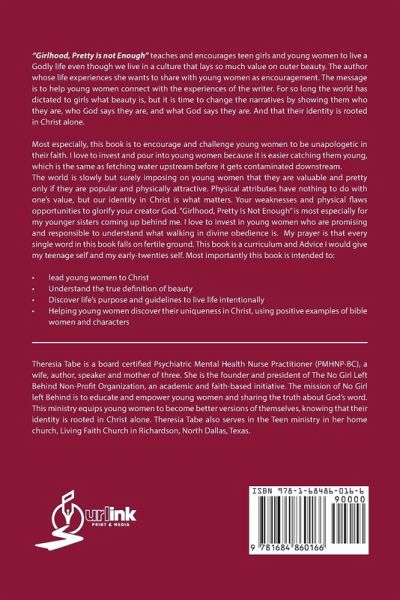 "Girlhood, Pretty Is not Enough" teaches and encourages teen girls and young women to live a Godly life even though we live in a culture that lays so much value on outer beauty. The author whose life experiences she wants to share with young women as encouragement. The message is to help young women connect with the experiences of the writer. For so long the world has dictated to girls what beauty is, but it is time to change the narratives by showing them who they are, who God says they are, and what God says they are. And that their identity is rooted in Christ alone. Most especially, this book is to encourage and challenge young women to be unapologetic in their faith. I love to invest and pour into young women because it is easier catching them young, which is the same as fetching water upstream before it gets contaminated downstream. The world is slowly but surely imposing on young women that they are valuable and pretty only if they are popular and physically attractive. Physical attributes have nothing to do with one's value, but our identity in Christ is what matters. Your weaknesses and physical flaws opportunities to glorify your creator God. "Girlhood, Pretty is not Enough" is most especially for my younger sisters coming up behind me. I love to invest in young women who are promising and responsible to understand what walking in divine obedience is. My prayer is that every single word in this book falls on fertile ground. This book is a curriculum and Advice I would give my teenage self and my early-twenties self. Most importantly this book is intended to: lead young women to Christ Understand the true definition of beauty Discover life's purpose and guidelines to live life intentionally Helping young women discover their uniqueness in Christ, using positive examples of bible women characters.