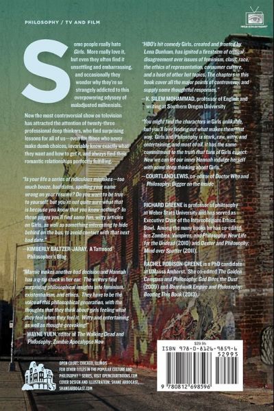 The drama-comedy show Girls -- often under-rated by being perceived as Sex and the City for the Millennial generation -- has made TV history and provoked controversy for its pitilessly accurate portrayal of four oddly sympathetic twenty-something female characters, notable for their self-absorption, empathy deficits, and ineptitude with relationships. Among other breakthroughs, it is the first show to depict the sex act among the alienated young as nearly always awkward and unfulfilling. In Girls and Philosophy, a team of diverse yet always sensitive, empathic, and ept philosophers approach the world of Girls from a variety of angles and philosophical points of view.