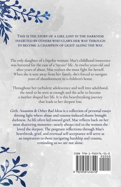 The only daughter of a bipolar woman, Mae's childhood innocence was bartered for the ease of a "secure" life. At twelve years old and after years of abuse, Mae realizes she must fight for herself. When she is sent away from her family, she's forced to navigate years of abandonment in a children's home. Throughout her turbulent adolescence and well into adulthood, the need to be seen as enough and the ache to become a mother shaped her life. It is this heartbreaking journey that leads to her deepest loss. Girls, Assassins & Other Bad Ideas is a collection of personal essays shining light where abuse and trauma-induced shame brought darkness. As life often led toward grief, Mae reflects back on her most shattering moments-nearly always tied to the women she loved the deepest. The poignant reflections through Mae's heartbreak, grief, and eventual self-acceptance will serve as an inspiration to those navigating hardship and trauma, reminding us we are not alone.