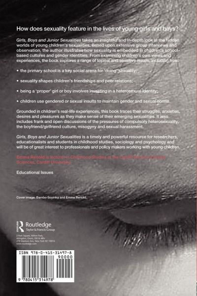 Girls, Boys and Junior Sexualities takes an insightful and in-depth look at the hidden worlds of young children's sexualities. Based upon extensive group interviews and observation, the author illustrates how sexuality is embedded in children's school-based cultures and gender identities. From examining children's own views and experiences, the book explores a range of topical and sensitive issues, including how: the primary school is a key social arena for 'doing' sexuality sexuality shapes children's friendships and peer relations being a 'proper' girl or boy involves investing in a heterosexual identity children use gendered or sexual insults to maintain gender and sexual norms. Grounded in children's real-life experiences, this book traces their struggles, anxieties, desires and pleasures as they make sense of their emerging sexualities. It also includes frank and open discussions of the pressures of compulsory heterosexuality, the boyfriend/girlfriend culture, misogyny and sexual harassment. Girls, Boys and Junior Sexualities is a timely and powerful resource for researchers, educationalists and students in childhood studies, sociology and psychology and will be of great interest to professionals and policy makers working with young children.