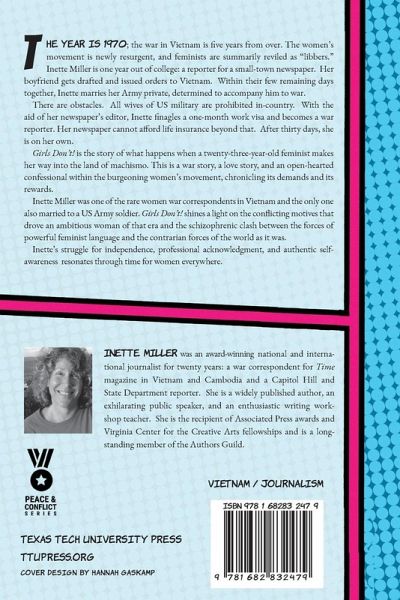 The year is 1970; the war in Vietnam is five years from over. The women's movement is newly resurgent, and feminists are summarily reviled as "libbers." Inette Miller is one year out of college--a reporter for a small-town newspaper. Her boyfriend gets drafted and is issued orders to Vietnam. Within their few remaining days together, Inette marries her US Army private, determined to accompany him to war. There are obstacles. All wives of US military are prohibited in-country. With the aid of her newspaper's editor, Miller finagles a one-month work visa and becomes a war reporter. Her newspaper cannot afford life insurance beyond that. After thirty days, she is on her own. As one of the rare woman war correspondents in Vietnam and the only one also married to an Army soldier, Miller's experience was pathbreaking. Girls Don't shines a light on the conflicting motives that drive an ambitious woman of that era and illustrates the schizophrenic struggle between the forces of powerful feminist ideology and the contrarian forces of the world as it was. Girls Don't is the story of what happens when a twenty-three-year-old feminist makes her way into the land of machismo. This is a war story, a love story, and an open-hearted confessional within the burgeoning women's movement, chronicling its demands and its rewards.