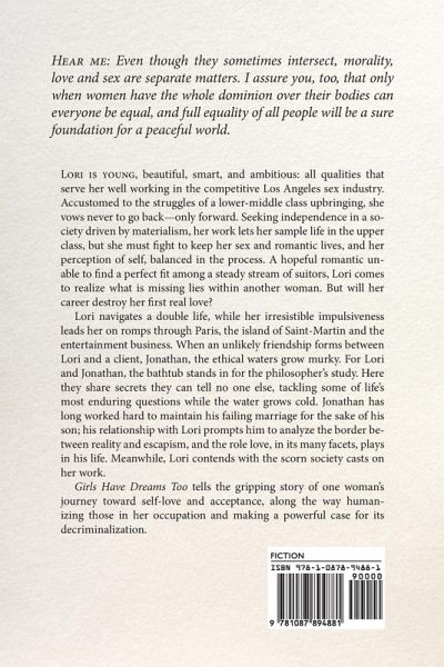Hear me: Even though they sometimes intersect, morality, love and sex are separate matters. I assure you, too, that only when women have the whole dominion over their bodies can everyone be equal, and full equality of all people will be a sure foundation for a peaceful world. Lori is young, beautiful, smart, and ambitious: all qualities that serve her well working in the competitive Los Angeles sex industry. Accustomed to the struggles of a lower-middle class upbringing, she vows never to go back-only forward. Seeking independence in a society driven by materialism, her work lets her sample life in the upper class, but she must fight to keep her sex and romantic lives, and her perception of self, balanced in the process. A hopeful romantic unable to find a perfect fit among a steady stream of suitors, Lori comes to realize what is missing lies within another woman. But will her career destroy her first real love?Lori navigates a double life, while her irresistible impulsiveness leads her on romps through Paris, the island of Saint Martin and the entertainment business. When an unlikely friendship forms between Lori and a client, Jonathan, the ethical waters grow murky. For Lori and Jonathan, the bathtub stands in for the philosopher's study. Here they share secrets they can tell no one else, tackling some of life's most enduring questions while the water grows cold. Jonathan has long worked hard to maintain his failing marriage for the sake of his son; his relationship with Lori prompts him to analyze the border between reality and escapism, and the role love, in its many facets, plays in his life. Meanwhile, Lori contends with the scorn society casts on her work.Girls Have Dreams Too tells the gripping story of one woman's journey toward self-love and acceptance, along the way humanizing those in her occupation and making a powerful case for its legalization.