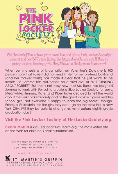 Inspired by the popular KidsHealth website, THE PINK LOCKER SOCIETY features a trio of teens who have taken on a mysterious mission--to help middle school girls by answering their questions about anything, especially the PBBs (Periods, Bras, and Boys). For the first time in a long time, Jemma, Piper, and Kate have tossed boys aside to spend time on their one true love: THE PINK LOCKER SOCIETY. And with the help of two-well placed school officials, they're back in their swanky pink offices. But how long will it last? Jemma is juggling school, the cross country team, becoming a big sister, and all the Pink Locker action, including a tough new problem from a bullied classmate. With 8th grade graduation around the corner, the girls have to decide who will carry on the Pink Locker Society's important mission. Are there 7th graders who have the right stuff to be in the PLS? And just as Jemma's life is bursting with excitement, Forrest reappears and seems genuinely interested in her. Even though she keeps him at arms' length, she has one lingering question: Was he the one who sent her a pink carnation on Valentine's Day? From crushes, to friendship, to family surprises, GIRLS IN CHARGE explores the concerns that so many young girls talk about with their friends. Funny, entertaining, and honest, this fourth installment of the Pink Locker Society series feels like having your BFF by your side.
