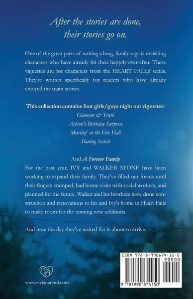 After the happily-ever-afters, their stories go on. A collection of short stories in the Heart Falls world by New York Times bestselling Author Vivian Arend. One of the great parts of writing a long family saga is that I get to revisit characters who have already found their happily-ever-after. Over the past years, I've written short vignettes featuring beloved characters from the Heart Falls series. They're written specifically for readers who have already enjoyed the main stories. Some of these visits with favourite friends were previously sent out in newsletters. Check first to see where each vignette fits into the full series if you want to avoid spoilers for books you haven't yet read! This collection contains a brand-new short story for Walker and Ivy Stone, as well, and it's the ONLY place to read this story! THIS COLLECTION CONTAINS: Reading List for Heart Falls AND a family tree/character list The following girls/guys night out vignettes: Glamour & Truth Ashton's Birthday Surprise Mischief at the Fire Hall Sharing Secrets And the short story: A Forever Family For the past year, Ivy and Walker Stone have been working to expand their family. They've filled out forms until their fingers cramped, had home visits with social workers, and planned for the future. Walker and his brothers have done construction and renovations to his and Ivy's home in Heart Falls to make room for the coming new additions. And now the day they've waited for is about to arrive. *Bonus... Tucker and Ginny's wedding is included in this story!