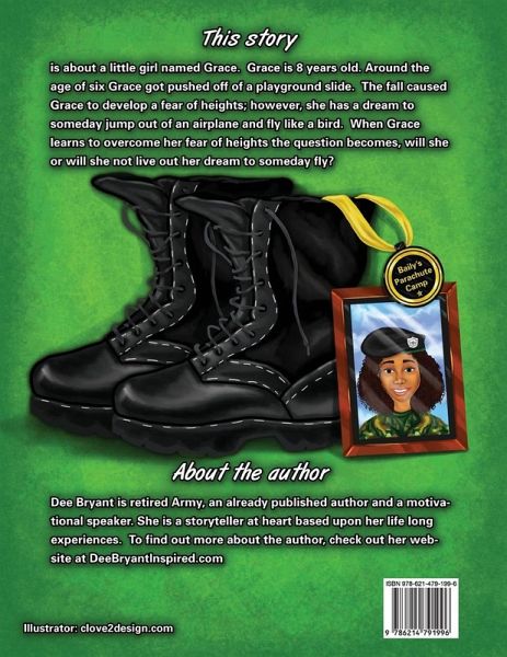 In Girls Wear Combat Boots Too, young Grace, who is afraid of heights after a playground accident, is very excited to go to her neighborhood air show. Her mom was a parachutist in the army, and Grace has always dreamed of wearing combat boots and following in her mom's footsteps, but first she must learn to overcome her fear of heights. When she does overcome her fear, the question becomes, Will she or will she not live out her dream to someday fly in the air like a bird?