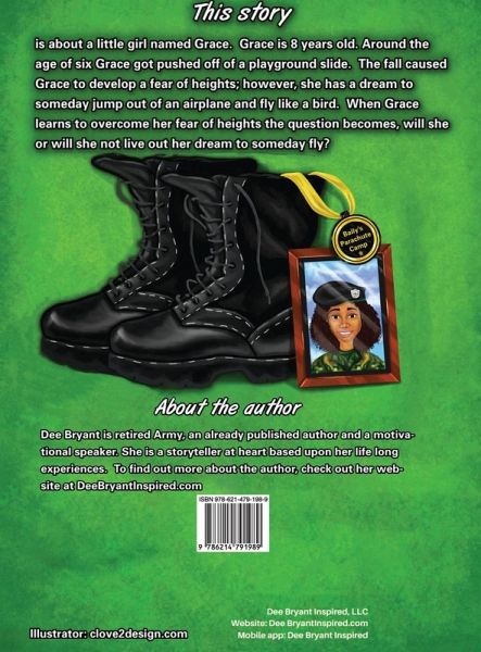 In Girls Wear Combat Boots Too, young Grace, who is afraid of heights after a playground accident, is very excited to go to her neighborhood air show. Her mom was a parachutist in the army, and Grace has always dreamed of wearing combat boots and following in her mom's footsteps, but first she must learn to overcome her fear of heights. When she does overcome her fear, the question becomes, Will she or will she not live out her dream to someday fly in the air like a bird?
