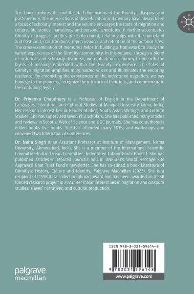 This book explores the multifaceted dimensions of the Girmitya diaspora and post-memory. The intersections of dis/re-location and memory have always been a focus of scholarly interest and the volume envisages the roots of migration and culture, life stories, narratives, and personal anecdotes. It further accentuates Girmitiya struggles, politics of displacement, relationships with the homeland and host land, oral traditions, repercussions, and retention of the archival sites. The cross-examination of memories helps in building a framework to study the varied experiences of the Girmitiya community. In this volume, through a blend of historical and scholarly discourse, we embark on a journey to unearth the layers of meaning embedded within the Girmitya experience. The tales of Girmitya migration amplifies marginalized voices and illuminates the enduring resilience. By chronicling the experiences of the indentured migration, we pay homage to the pioneers, recognize the intricacy of their toils, and commemorate the continuing legacy.