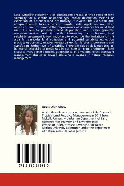 Land suitability evaluation is an examination process of the degree of land suitability for a specific utilization type and/or description method or estimation of potential land productivity. It involves the execution and interpretation of basic surveys of climate, soils, vegetation and other aspects of land in terms of the requirements of alternative forms of land use. This help to preventing land degradation and further generate maximum possible production with minimum input cost. Because, land suitability assessment is very important to recognize the limitations of the area for particular land utilization and potential suitability evaluation provides opportunity to take necessary steps for further improvement and transferring higher level of suitability. Therefore this book is supposed to be useful especially professionals in soil science, crop production, land resource management studies, geographical information, forest ecosystem management studies or anyone else who is involved in natural resource management.