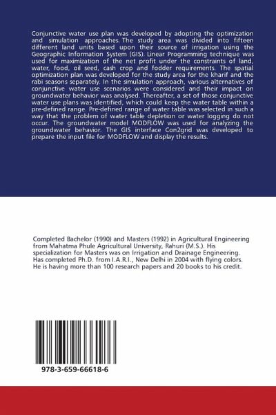 Conjunctive water use plan was developed by adopting the optimization and simulation approaches. The study area was divided into fifteen different land units based upon their source of irrigation using the Geographic Information System (GIS). Linear Programming technique was used for maximization of the net profit under the constraints of land, water, food, oil seed, cash crop and fodder requirements. The spatial optimization plan was developed for the study area for the kharif and the rabi seasons separately. In the simulation approach, various alternatives of conjunctive water use scenarios were considered and their impact on groundwater behavior was analysed. Thereafter, a set of those conjunctive water use plans was identified, which could keep the water table within a pre-defined range. Pre-defined range of water table was selected in such a way that the problem of water table depletion or water logging do not occur. The groundwater model MODFLOW was used for analyzing the groundwater behavior. The GIS interface Con2grid was developed to prepare the input file for MODFLOW and display the results.