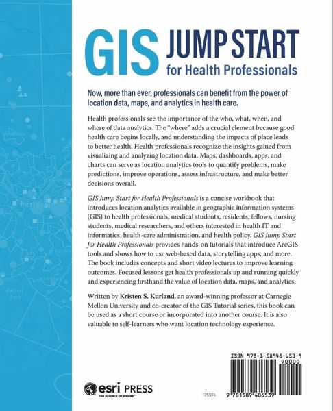Now, more than ever, professionals can benefit from the power of location data, maps, and analytics in healthcare. Health professionals see the importance of the who, what, when, and where of data analytics. The "where" adds a crucial element because good healthcare begins locally and understanding the impacts of place leads to better health. Health professionals recognize the insights gained from visualizing and analyzing location data. Maps, dashboards, apps, and charts can serve as location analytic tools to quantify problems, make predictions, improve operations, assess infrastructure, and make better decisions overall. GIS Jump Start for Health Professionals is a concise workbook that introduces location analytics available in geographic information systems (GIS) to health professionals, medical students, residents, fellows, nursing students, medical researchers, and others interested in health IT and informatics, health-care administration, and health policy. GIS Jump Start for Health Professionals provides hands-on tutorials that introduce the ArcGIS tools and shows how to use web-based data, storytelling apps, and much more. The book includes concepts and short video lectures to improve learning outcomes. Focused lessons get health professionals up and running quickly and experiencing first hand the value of location data, maps, and analytics. Written by Kristen S. Kurland, an award-winning professor at Carnegie Mellon University and co-creator of the GIS Tutorial series, this book can be used as a short course or incorporated into another course. It is also valuable to self-learners who want location technology experience.