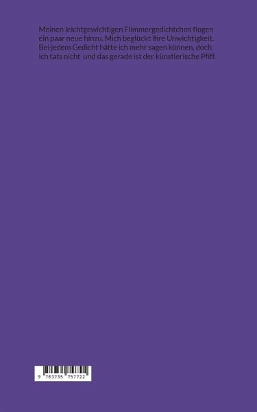 Meinen leichtgewichtigen Flimmergedichtchen flogen ein paar neue hinzu. Mich beglückt ihre Unwichtigkeit. Bei jedem Gedicht hätte ich mehr sagen können, doch ich tats nicht und das gerade ist der künstlerische Pfiff.