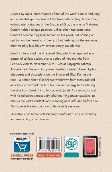 A sloka-by-sloka interpretation of one of the world's most enduring and influential spiritual texts of the twentieth century. Among the various interpretations of the Bhagavad Gita, the one by Mahatma Gandhi holds a unique position. Unlike other interpretations, Gandhi's commentary is direct and to the point, not offering an opinion on the meaning of the text, but fleshing out the message, often relating it to his own extraordinary experiences. Gandhi interpreted the Bhagavad Gita, which he regarded as a gospel of selfless action, over a period of nine months from February 24th to November 27th, 1926 at Satyagrah Ashram, Ahmedabad. The morning prayer meetings were followed by his discourses and discussions on the Bhagavad Gita. During this time-a period when Gandhi had withdrawn from mass political activity-he devoted much of his time and energy to translating the Gita from Sanskrit into his native Gujarati. As a result, he met with his followers almost daily, after morning prayer sessions, to discuss the Gita's contents and meaning as it unfolded before him. This book is the transcription of those daily sessions. This book has been professionally proofread to ensure accuracy and readability on all devices. ABOUT THE AUTHOR: Mohandas Karamchand Gandhi, was the prominent figure in the freedom struggle in India from the British rule. He is also known as the 'The Father of the Nation', in India. The author has written a number of books and some of them include Character & Nation Building, India of My Dreams, and All Men are Brothers. The author was born on the 2nd of October, 1869, in Porbandar, Gujarat. In the year 1942, he played a key role in launching the Quit India movement, which was intended at forcing the British to leave the nation. As a result of launching this movement, he was thrown in prison and remained there for several years, due to other political offenses allegedly committed by him. At all times, he practised satyagraha, which is the teaching of non-violence. As the British rule ended, he was saddened by India's partition, and tried his best to bring peace among the Sikhs and Muslims. On the 30th of January, 1948, Mahatma Gandhi was shot dead by a Hindu nationalist, for allegedly being highly concerned about the nation's Muslim population.