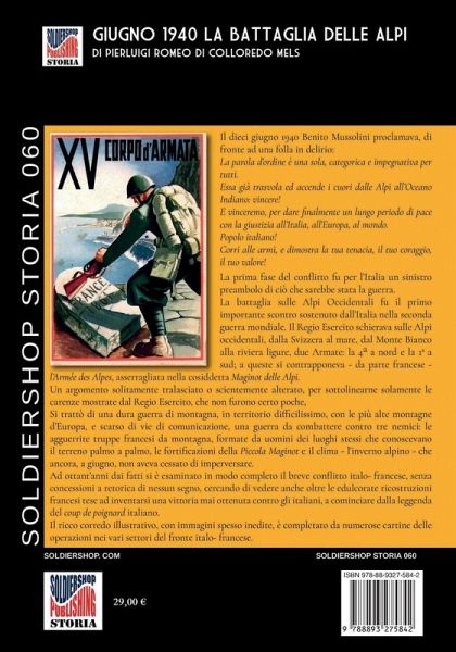 Il dieci giugno 1940 Benito Mussolini proclamava, di fronte ad una folla in delirio:La parola d'ordine è una sola, categorica e impegnativa per tutti.Essa già trasvola ed accende i cuori dalle Alpi all'Oceano Indiano: vincere!E vinceremo, per dare finalmente un lungo periodo di pace con la giustizia all'Italia, all'Europa, al mondo.Popolo italiano!Corri alle armi, e dimostra la tua tenacia, il tuo coraggio, il tuo valore!La prima fase del conflitto fu per l'Italia un sinistro preambolo di ciò che sarebbe stata la guerra.La battaglia sulle Alpi Occidentali fu il primo importante scontro sostenuto dall'Italia nella seconda guerra mondiale. Il Regio Esercito schierava sulle Alpi occidentali, dalla Svizzera al mare, dal Monte Bianco alla riviera ligure, due Armate: la 4a a nord e la 1a a sud; a queste si contrapponeva - da parte francese - l'Armée des Alpes, asserragliata nella cosiddetta Maginot delle Alpi.Un argomento solitamente tralasciato o scientemente alterato, per sottolinearne solamente le carenze mostrate dal Regio Esercito, che non furono certo poche.Si trattò di una dura guerra di montagna, in territorio difficilissimo, con le più alte montagne d'Europa, e scarso di vie di comunicazione, una guerra da combattere contro tre nemici: le agguerrite truppe francesi da montagna, formate da uomini dei luoghi stessi che conoscevano il terreno palmo a palmo, le fortificazioni della Piccola Maginot e il clima - l'inverno alpino - che ancora, a giugno, non aveva cessato di imperversare.Ad ottant'anni dai fatti si è esaminato in modo completo il breve conflitto italo- francese, senza concessioni a retorica di nessun segno, cercando di vedere anche oltre le edulcorate ricostruzioni francesi tese ad inventarsi una vittoria mai ottenuta contro gli italiani, a cominciare dalla leggenda del coup de poignard italiano. Il ricco corredo illustrativo, con immagini spesso inedite, è completato da numerose cartine delle operazioni nei vari settori del fronte italo- francese.