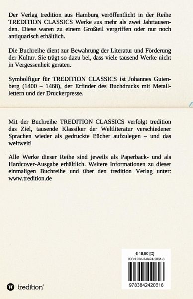 Dieses Werk ist Teil der Buchreihe TREDITION CLASSICS. Der Verlag tredition aus Hamburg veröffentlicht in der Buchreihe TREDITION CLASSICS Werke aus mehr als zwei Jahrtausenden. Diese waren zu einem Großteil vergriffen oder nur noch antiquarisch erhältlich. Mit der Buchreihe TREDITION CLASSICS verfolgt tredition das Ziel, tausende Klassiker der Weltliteratur verschiedener Sprachen wieder als gedruckte Bücher zu verlegen und das weltweit! Die Buchreihe dient zur Bewahrung der Literatur und Förderung der Kultur. Sie trägt so dazu bei, dass viele tausend Werke nicht in Vergessenheit geraten.