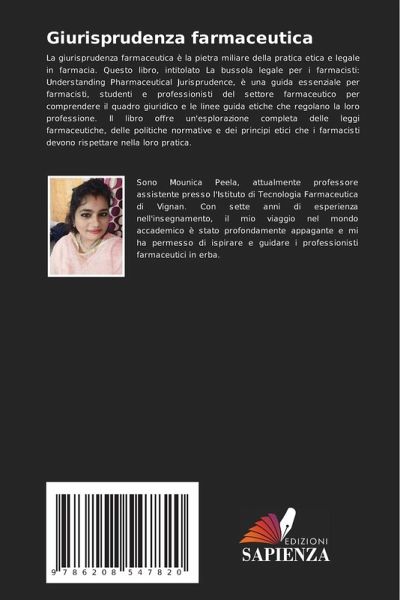 La giurisprudenza farmaceutica è la pietra miliare della pratica etica e legale in farmacia. Questo libro, intitolato La bussola legale per i farmacisti: Understanding Pharmaceutical Jurisprudence, è una guida essenziale per farmacisti, studenti e professionisti del settore farmaceutico per comprendere il quadro giuridico e le linee guida etiche che regolano la loro professione. Il libro offre un'esplorazione completa delle leggi farmaceutiche, delle politiche normative e dei principi etici che i farmacisti devono rispettare nella loro pratica.