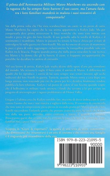 Il pilota dell'Aeronautica Militare Mateo Matthews sta uscendo con la ragazza che ha sempre fatto battere il suo cuore, ma l'amara faida tra i loro familiari manderà in malora i suoi tentativi di conquistarla? Sin dalla prima volta che l'ha vista scarabocchiare un cuore su un pezzo di carta, Mateo Matthews ha capito che la sua anima apparteneva a Kailyn Jade. Ma per conquistarla deve prima attraversare le linee nemiche che sono state minate con insulti e prese in giro dai loro fratelli. Il suo gemello odia la sorella di Kailyn e il sentimento è ricambiato. Mateo in passato ha tenuto la bocca chiusa per evitare di coinvolgere lei nella guerra tra i loro fratelli. Ma ora ha smesso di cercare di mantenere la pace e giura di voler raggiungere esclusivamente la tranquillità possibile solo con Kailyn tra le braccia. Proprio quando pensa che nulla possa ostacolare la sua ricerca, tra Mateo e la donna che gli fa battere il cuore si frappone un'opportunità che potrebbe far decollare la carriera di entrambi. Nel suo lavoro di artista, Kailyn Jade studia alcune delle opere d'arte più stimolanti del mondo. Ma nessuna le toglie il fiato come il sorriso di Mateo. A differenza dei quadri che lei riproduce, i sorrisi di lui sono sempre stati tenuti nascosti agli occhi indiscreti dei loro fratelli in guerra. Tuttavia, quando Mateo torna a casa dopo una lunga assenza, non nasconde più ciò che prova per lei e desidera finalmente rendere pubblica la loro relazione. Kailyn è sul punto di cedere al suo fascino quando scopre che il bellissimo ex militare vuole ottenere i fondi che servono a lei per avviare un progetto di arteterapia per i ragazzi problematici di Honor Valley. Litigare è l'ultima cosa che Kailyn vorrebbe fare, ma teme di dover imbracciare le armi contro l'uomo che non è mai riuscita a togliersi dalla testa. Il tentativo di convincerla che non sono in competizione passa presto in secondo piano per Mateo quando i loro fratelli riaccendono l'infantile guerra che portano avanti da anni. Se vuole che Kailyn stia dalla sua parte, potrebbe essere costretto a tenere il gemello a distanza. Riusciranno questi due amanti stanchi a trovare la pace o la faida che coinvolge i loro familiari farà a pezzi i loro cuori? Scoprilo in "Giuro di rispettarti", la quinta di una serie di storie commoventi che dimostrano che innamorarsi è un atto di eroismo e che trovare una famiglia è il traguardo più straordinario della vita.