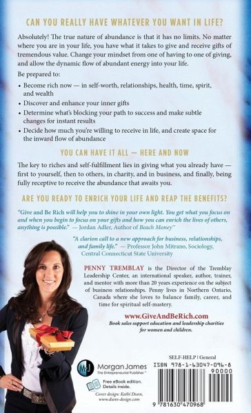 Can you really have whatever you want in life? Absolutely! The true nature of abundance is that it has no limits. No matter where you are in your life, you have what it takes to give and receive gifts of tremendous value. Change your mindset from one of having to one of giving, and allow the dynamic flow of abundant energy into your life. Be prepared to: * Become rich now---in self-worth, relationships, health, time, spirit, and wealth; * Discover and enhance your inner gifts; * Determine what's blocking your path to success and make subtle changes for instant results * Decide how much you're willing to receive in life, and create space for the inward flow of abundance. You can have it all, here and now. The key to riches and self-fulfillment lies in giving what you already have---first to yourself, then to others, in charity and in business, and finally, being fully receptive to receive the abundance that awaits you. Are you ready to enrich your life and reap the benefits?