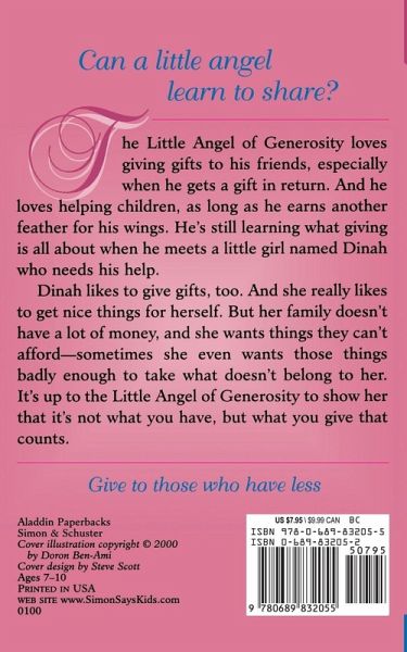 The Little Angel of Generosity loves giving gifts to his friends, especially when he gets a gift in return. And he loves helping children, as long as he earns another feather for his wings. He's still learning what giving is all about when he meets a little girl named Dinah, who needs his help. Dinah likes to give gifts, too. And she really likes to get nice things for herself. But her family doesn't have a lot of money, and sometimes she wants things they can't afford -- sometimes she even wants those things badly enough to take what doesn't belong to her. It's up to the Little Angel of Generosity to show her that it's not what you have, but what you give that counts.