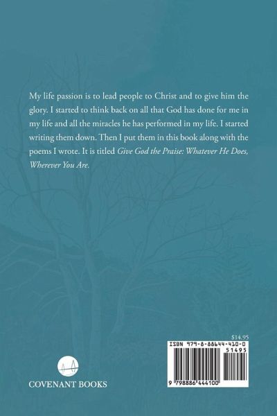 My life passion is to lead people to Christ and to give him the glory. I started to think back on all that God has done for me in my life and all the miracles he has performed in my life. I started writing them down. Then I put them in this book along with the poems I wrote. It is titled Give God the Praise: Whatever He Does, Wherever You Are.