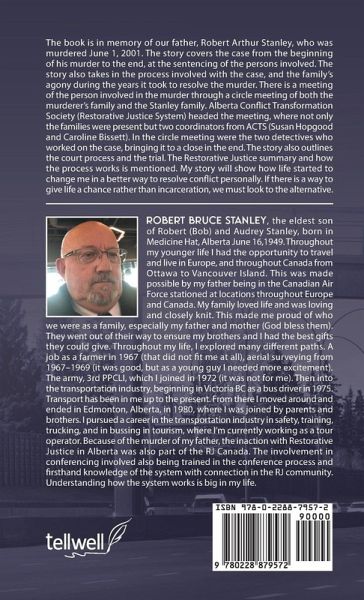 The book is in memory of our father, Robert Arthur Stanley, who was murdered June 1, 2001. The story covers the case from the beginning of his murder to the end, at the sentencing of the persons involved. The story also takes in the process involved with the case, and the family's agony during the years it took to resolve the murder. There is a meeting of the person involved in the murder through a circle meeting of both the murderer's family and the Stanley family. Alberta Conflict Transformation Society (Restorative Justice System) headed the meeting, where not only the families were present but two coordinators from ACTS (Susan Hopgood and Caroline Bissett). In the circle meeting were the two detectives who worked on the case, bringing it to a close in the end. The story also outlines the court process and the trial. The Restorative Justice summary and how the process works is mentioned. My story will show how life started to change me in a better way to resolve conflict personally. If there is a way to give life a chance rather than incarceration, we must look to the alternative.