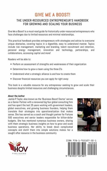 Give Me a Boost' is a must-read guide for historically under-resourced entrepreneurs who face challenges due to limited resources and minimal relationships. This practical handbook provides entrepreneurs with strategies and advice to overcome unique obstacles, covering topics in a digestible, easy to understand manner. Topics include risk management, marketing and branding, talent recruitment and retention, personal energy management, innovation and technology, partnerships, and collaborations, accessing capital and more! Readers will be able to: ¿Perform an assessment of strengths and weaknesses of their organization ¿Determine how to grow a team using the three D's ¿Understand what a strategic alliance is and how to create them ¿Discover financial resources you can apply for right away This book is a valuable resource for any entrepreneur seeking to grow and scale their business despite limited resources and challenging circumstances.