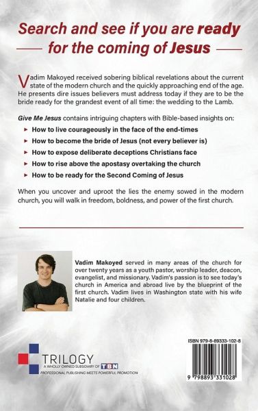Search and see if you are ready for the coming of Jesus Vadim Makoyed received sobering biblical revelations about the current state of the modern church and the quickly approaching end of the age. He presents dire issues believers must address today if they are to be the bride ready for the grandest event of all time: the wedding to the Lamb. Give Me Jesus contains intriguing chapters with Bible-based insights on: ¿ How to live courageously in the face of the end-times ¿ How to become the bride of Jesus (not every believer is) ¿ How to expose deliberate deceptions Christians face ¿ How to rise above the apostasy overtaking the church ¿ How to be ready for the second coming of Jesus When you uncover and uproot the lies the enemy sowed in the modern church, you will walk in freedom, boldness, and power of the first church.