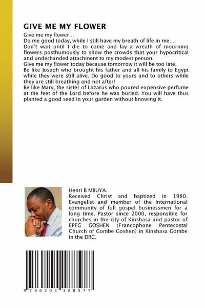 Give me my flower...Do me good today, while I still have my breath of life in me...Don't wait until I die to come and lay a wreath of mourning flowers posthumously to show the crowds that your hypocritical and underhanded attachment to my modest person.Give me my flower today because tomorrow it will be too late.Be like Joseph who brought his father and all his family to Egypt while they were still alive. Do good to yours and to others while they are still breathing and not after!Be like Mary, the sister of Lazarus who poured expensive perfume at the feet of the Lord before he was buried. You will have thus planted a good seed in your garden without knowing it.