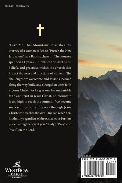 "Give Me This Mountain" describes the journey of a woman called to "Preach the New Jerusalem" in a Baptist church. The journey spanned 44 years. It tells of the doctrines, beliefs, and practices within the church that impact the roles and functions of women. The challenges we overcome and lessons learned along the way build and strengthen one's faith in Jesus Christ. As long as one has undeniable faith and trust in Jesus Christ, no mountain is too high to reach the summit. We become successful in our endeavors through Jesus Christ, who teaches the way. One can reach her/his destiny regardless of the obstacles or barriers placed along the way if you "Study", "Pray" and "Wait" on the Lord.