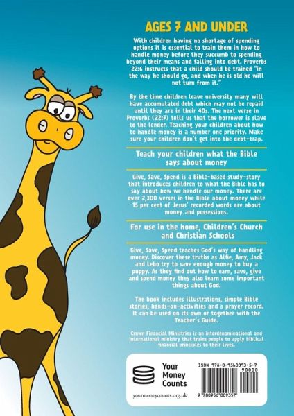 Ages 7 and under With children having no shortage of spending options it is essential to train them in how to handle money before they succumb to spending beyond their means and falling into debt. Proverbs 22:6 instructs that a child should be trained "in the way he should go, and when he is old he will not turn from it." By the time children leave university many will have accumulated debt which may not be repaid until they are in their 40s. The next verse in Proverbs (22:7) tells us that the borrower is slave to the lender. Teaching your children about how to handle money is a number one priority. Make sure your children don’t get into the debt-trap. Teach your children what the Bible says about money Give, Save, Spend is a Bible-based study-story that introduces children to what the Bible has to say about how we handle our money. There are over 2,300 verses in the Bible about money while 15 per cent of Jesus’ recorded words are about money and possessions. For use in the home, Children’s Church and Christian Schools Give, Save, Spend teaches God’s way of handling money. Discover these truths as Alfie, Amy, Jack and Lebo try to save enough money to buy a puppy. As they find out how to earn, save, give and spend money they also learn some important things about God. The book includes illustrations, simple Bible stories, hands-on-activities and a prayer record. It can be used on its own or together with the Teacher’s Guide. Your Money Counts is an interdenominational and international ministry that trains people to apply biblical financial principles to their lives.