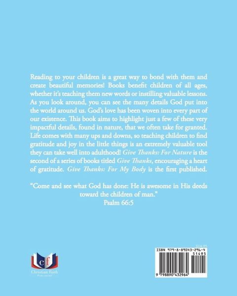 Reading to your children is a great way to bond with them and create beautiful memories! Books benefit children of all ages, whether it's teaching them new words or instilling valuable lessons. As you look around, you can see the many details God put into the world around us. God's love has been woven into every part of our existence. This book aims to highlight just a few of these very impactful details, found in nature, that we often take for granted. Life comes with many ups and downs, so teaching children to find gratitude and joy in the little things is an extremely valuable tool they can take well into adulthood! Give Thanks: For Nature is the second of a series of books titled Give Thanks, encouraging a heart, of gratitude. Give Thanks: For My Body is the first published. "Come and see what God has done: He is awesome in His deeds toward the children of man." Psalm 66:5Psalm 5