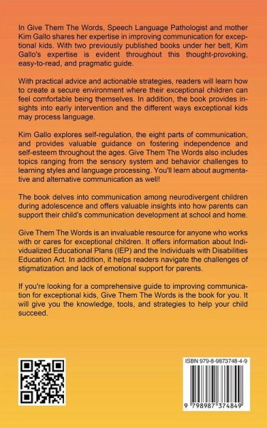 Give Them The Words is a must-read for anyone seeking practical advice and actionable strategies to improve communication for exceptional kids. Written by Speech Language Pathologist and mother Kim Gallo, this thought-provoking, easy-to-read, and pragmatic guide draws upon Gallo's expertise in early intervention and her previous published works. Through her insights into self-regulation, the eight parts of communication, and fostering independence and self-esteem, Gallo empowers readers to create a secure environment where their exceptional children can feel comfortable being themselves. She also provides valuable guidance on navigating various topics, from the sensory system and behavior challenges to learning styles and language processing. Gallo's expertise extends to augmentative and alternative communication, making this book an invaluable resource for anyone who works with or cares for exceptional children. She also addresses the communication challenges among neurodivergent children during adolescence and offers valuable insights into how parents can support their child's communication development at school and home. In addition to providing information about Individualized Educational Plans (IEP) and the Individuals with Disabilities Education Act, Give Them The Words helps readers navigate the challenges of stigmatization and lack of emotional support for parents. Whether you're a parent, teacher, or caregiver, this comprehensive guide will equip you with the knowledge, tools, and strategies to help your child succeed. Give Them The Words is an indispensable resource for anyone who wants to help exceptional children thrive. With its practical advice and actionable strategies, this book is a must-read for anyone who cares about improving communication for exceptional kids.