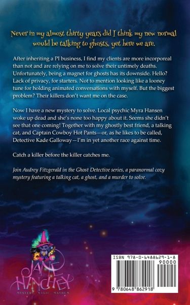Never in my almost thirty years did I think my new normal would be talking to ghosts, yet here we are. After inheriting a PI business, I find my clients are more incorporeal than not and are relying on me to solve their untimely deaths. Unfortunately, being a magnet for ghosts has its downside. Hello? Lack of privacy, for starters. Not to mention looking like a looney tune for holding animated conversations with myself. But the biggest problem? Their killers don't want me on the case. Now I have a new mystery to solve. Local psychic Myra Hansen woke up dead and she's none too happy about it. Seems she didn't see that one coming! Together with my ghostly best friend, a talking cat, and Captain Cowboy Hot Pants-or, as he likes to be called, Detective Kade Galloway-I'm in yet another race against time. Catch a killer before the killer catches me. Join Audrey Fitzgerald in the Ghost Detective series, a paranormal cozy mystery featuring a talking cat, a ghost, and a murder to solve.
