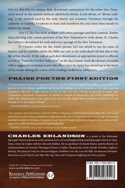 Give Us This Day is a unique daily devotional commentary for the entire New Testament based on the ancient method called lectio divina. Lectio divina, or ""divine reading,"" is the method used by the early church and countless Christians through the centuries to read the Scriptures to form and transform the soul more than merely to inform the mind. Give Us This Day deals in depth with entire passages and their contexts. Rather than selecting only certain portions of the New Testament to write about, Fr. Charles has written a devotional for each and every passage of the New Testament. Fr. Charles writes for the whole person: he's not afraid to use his sense of humor, and he carefully relates the Bible not only to the individual's life but also to the life of the Church. At the end of each day's devotional, an appropriate Prayer is offered, as well as Points for Further Reflection on the day's lesson. Each devotional concludes with a suggested Resolution to put into effect what the Spirit has stirred up in the heart of the reader during the course of his reading, meditation, and prayer.