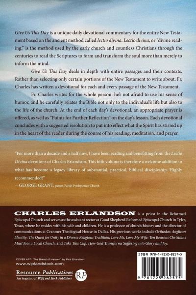 Give Us This Day is a unique daily devotional commentary for the entire New Testament based on the ancient method called lectio divina. Lectio divina, or ""divine reading,"" is the method used by the early church and countless Christians through the centuries to read the Scriptures to form and transform the soul more than merely to inform the mind. Give Us This Day deals in depth with entire passages and their contexts. Rather than selecting only certain portions of the New Testament to write about, Fr. Charles has written a devotional for each and every passage of the New Testament. Fr. Charles writes for the whole person: he's not afraid to use his sense of humor, and he carefully relates the Bible not only to the individual's life but also to the life of the Church. At the end of each day's devotional, an appropriate Prayer is offered, as well as Points for Further Reflection on the day's lesson. Each devotional concludes with a suggested Resolution to put into effect what the Spirit has stirred up in the heart of the reader during the course of his reading, meditation, and prayer.