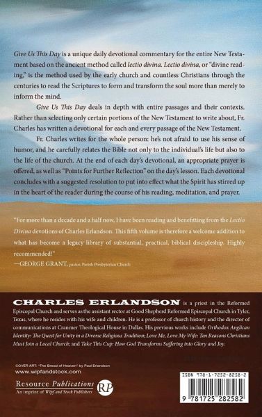 Give Us This Day is a unique daily devotional commentary for the entire New Testament based on the ancient method called lectio divina. Lectio divina, or ""divine reading,"" is the method used by the early church and countless Christians through the centuries to read the Scriptures to form and transform the soul more than merely to inform the mind. Give Us This Day deals in depth with entire passages and their contexts. Rather than selecting only certain portions of the New Testament to write about, Fr. Charles has written a devotional for each and every passage of the New Testament. Fr. Charles writes for the whole person: he's not afraid to use his sense of humor, and he carefully relates the Bible not only to the individual's life but also to the life of the Church. At the end of each day's devotional, an appropriate Prayer is offered, as well as Points for Further Reflection on the day's lesson. Each devotional concludes with a suggested Resolution to put into effect what the Spirit has stirred up in the heart of the reader during the course of his reading, meditation, and prayer.