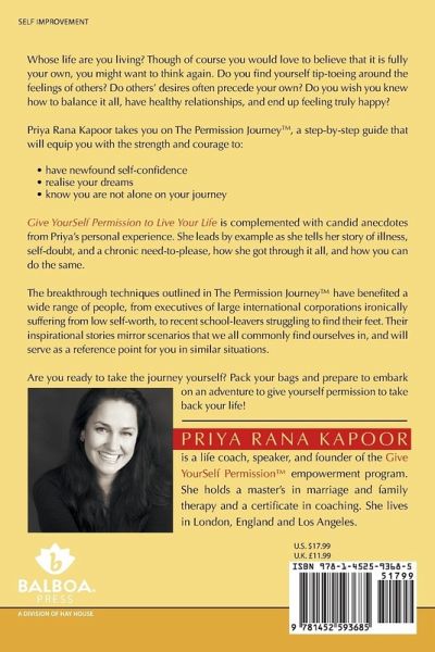 Whose life are you living? Though of course you would love to believe that it is fully your own, you might want to think again. Do you find yourself tip-toeing around the feelings of others? Do others' desires often precede your own? Do you wish you knew how to balance it all, have healthy relationships, and end up feeling truly happy? Priya Rana Kapoor takes you on The Permission Journey¿, a step-by-step guide that will equip you with the strength and courage to: ¿ have newfound self-confidence ¿ realise your dreams ¿ know you are not alone on your journey Give YourSelf Permission to Live Your Life is complemented with candid anecdotes from Priya's personal experience. She leads by example as she tells her story of illness, self-doubt, and a chronic need-to-please, how she got through it all, and how you can do the same. The breakthrough techniques outlined in The Permission Journey¿ have benefited a wide range of people, from executives of large international corporations ironically suffering from low self-worth, to recent school-leavers struggling to find their feet. Their inspirational stories mirror scenarios that we all commonly find ourselves in, and will serve as a reference point for you in similar situations. Are you ready to take the journey yourself? Pack your bags and prepare to embark on an adventure to give yourself permission to take back your life!