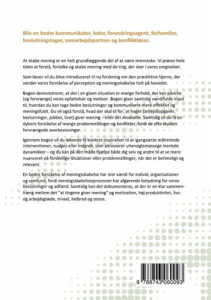 Bliv en bedre kommunikator, leder, forandringsagent, forhandler, beslutningstager, samarbejdspartner og konfliktløser. At skabe mening er en helt grundlæggende del af at være menneske. Vi prøver hele tiden at forstå, fortolke og skabe mening med de ting, der sker i vores omgivelser. Som læser vil du blive introduceret til ny forskning om den prædiktive hjerne, der vender vores forståelse af perception og meningsskabelse helt på hovedet. Bogen demonstrerer, at der i en given situation er mange forhold, der kan påvirke (og forvrænge) vores opfattelser og motiver. Bogen giver samtidig værdifulde input til, hvordan du kan tage bedre beslutninger og kommunikere mere effektivt og meningsfuldt. Du vil også forstå, hvad der skal til for, at noget (arbejdsopgaver, beslutninger, jobbet, livet) giver mening - eller det modsatte. Samtidig vil du få en dybere forståelse af mange problemstillinger og konflikter, fordi de ofte skyldes forvrængede overbevisninger. Igennem bogen vil du løbende få konkret inspiration til at igangsætte målrettede interventioner, nudges eller indgreb, som adresserer uhensigtsmæssige mentale dynamikker - og du kan på den måde hjælpe både dig selv og andre til at se mere nuanceret på forskellige situationer eller problemstillinger, når det er betimeligt og relevant. En bedre forståelse af meningsskabelse har stor værdi for individ, organisationer og samfund, fordi meningsskabelsesprocesser har afgørende betydning for vores beslutninger og adfærd. Samtidig kan det dokumenteres, at der er en klar sammenhæng mellem det "at tingene giver mening" og motivation, høj produktivitet, livs- og arbejdsglæde, trivsel, helbred og stress.