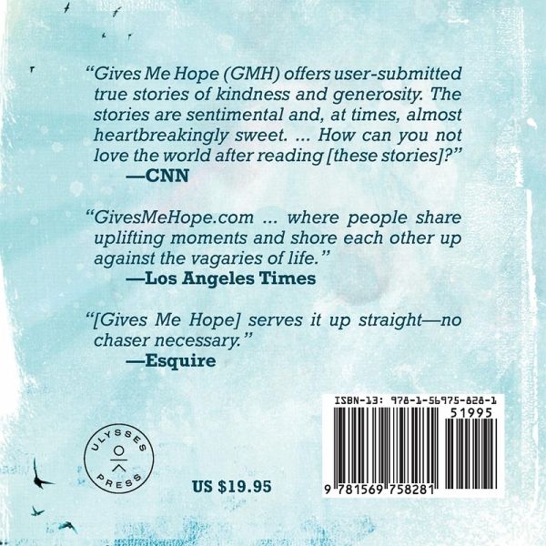 Discover life-changing stories of pure hope in the collection that the L.A. Times says is filled with “uplifting moments and shore each other up against the vagaries of life.” At GivesMeHope.com, visitors are invited to submit real-life stories that answer the profound question, "What gives you hope?" As diverse and touching as the human experience itself, the stories tell of life's magical moments. In this book, the very best of these stories are told artfully through the use of powerful, full-color imagery. “Gives Me Hope (GMH) offers user-submitted true stories of kindness and generosity. The stories are sentimental and, at times, almost heartbreakingly sweet. ... How can you not love the world after reading [these stories]?” —CNN “ GivesMeHope.com ... where people share uplifting moments and shore each other up against the vagaries of life.” —Los Angeles Times “ [Gives Me Hope] serves it up straight—no chaser necessary.” —Esquire