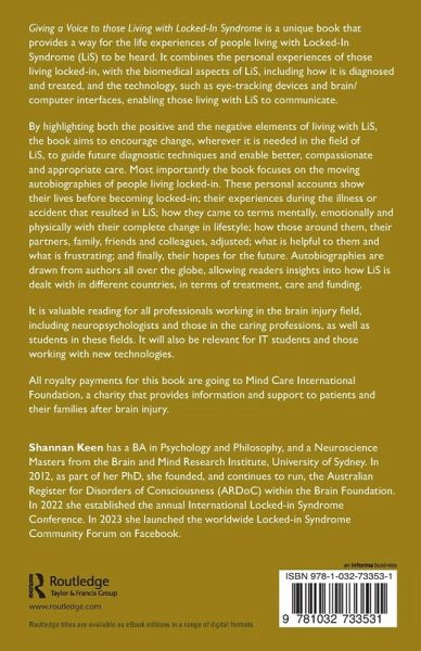 This is a unique book that provides a way for the life experiences of people living with Locked-In Syndrome (LiS) to be heard. It combines the personal experiences of those living locked-in, with the biomedical aspects of LiS.