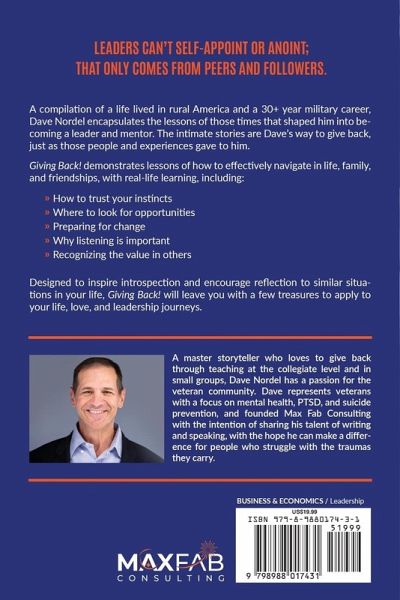Leaders can't self-appoint or anoint; that only comes from peers and followers. A compilation of a life lived in rural America and a 30+ year military career, Dave Nordel encapsulates the lessons of those times that shaped him into becoming a leader and mentor. The intimate stories are Dave's way to give back, just as those people and experiences gave to him. Giving Back! demonstrates lessons of how to effectively navigate in life, family, and friendships, with real-life learning, including: · How to trust your instincts · Where to look for opportunities · Preparing for change · Why listening is important · Recognizing the value in others Designed to inspire introspection and encourage reflection to similar situations in your life, Giving Back! will leave you with a few treasures to apply to your life, love, and leadership journeys.