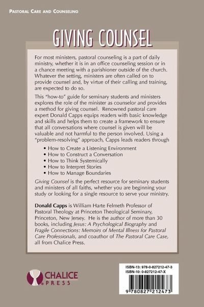 For most ministers, pastoral counseling is a part of daily ministry, whether it is in an office counseling session or in a chance meeting with a parishioner outside the church. Whatever the setting, ministers are often called on to provide counsel and, by virtue of their calling and training, are expected to do so. This "how-to" guide for seminary students and ministers explores the role of the minister as counselor and provides a method for giving counsel. Renowned pastoral care expert Donald Capps equips readers with basic knowledge and skills and helps them to create a framework to ensure that all conversations where counsel is given will be valuable and not harmful to the person involved. Using a "problem-resolving" approach, Capps leads readers through -- How to Create a Listening Environment -- How to Construct a Conversation -- How to Think Systemically -- How to Interpret Stories -- How to Manage Boundaries Giving Counsel is the perfect resource for seminary students and ministers of all faiths, whether you are beginning your study or looking for a single resource to serve your ministry.