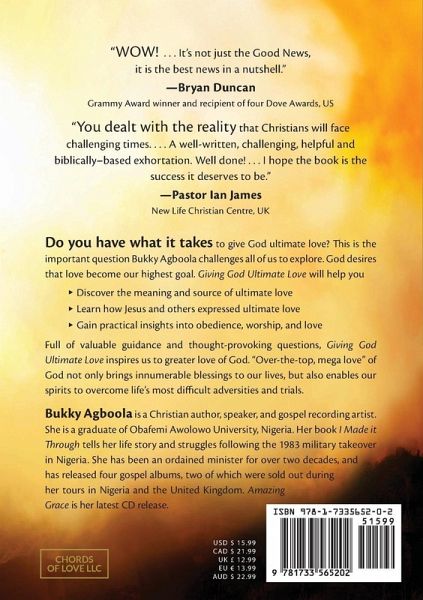 Do you have what it takes to give God ultimate love? This is the important question Bukky Agboola challenges all of us to explore. God desires that love become our highest goal. Giving God Ultimate Love will help you Discover the meaning and source of ultimate love Learn how Jesus and others expressed ultimate love Gain practical insights into obedience, worship, and love Full of valuable guidance and thought-provoking questions, Giving God Ultimate Love inspires us to greater love of God. "Over-the-top, mega love" of God not only brings innumerable blessings to our lives, but also enables our spirits to overcome life’s most difficult adversities and trials.