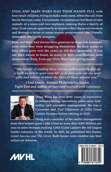 Evan and Mary Ward had their hands full with four small children, trying to make ends meet, when the call from Social Services came. Unfortunate circumstances led them to take custody of a niece and two nephews, making theirs a family of nine. Evan sees an opportunity to improve their financial situation and through a series of astute moves, perseverance, and friendly demeanor, the family prospers. Evan and Mary had always been generous to those less fortunate, even when they were struggling themselves. As their means to help others grew over the years, so did their generosity. It was not their nature to boast, so many of their contributions were anonymous. Truly, Evan and Mary Ward have giving hearts.