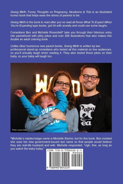 New Parent Smell: Funny Thoughts On Pregnancy, Newborns & Tots is an illustrated humor book that helps ease the stress of parents-to-be. New Parent Smell is the book to read after you've read one of those "What To Expect When You're Expecting" type books, got hit with anxiety and could use some laughs. Comedians Ben and Michelle Rosenfeld take you through their hilarious entry into parenthood with pithy jokes and over 100 illustrations. Unlike other humorous new parent books, New Parent Smell is written by two professional stand-up comedians who tested all this material on live audiences, so you'll actually laugh when reading it. They also tested these jokes on their baby, so your baby will laugh too.