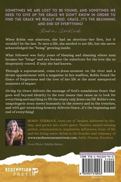 When Robin was nineteen, she had an abortion-her first, but it wouldn't be the last. To save a life, she needed tösee¿life, but she never acknowledged the "being" growing inside. ¿¿¿¿¿¿¿¿¿¿¿ What followed was forty years of blaming and shaming where men became her "kings" and sex became the substitute for the love she so desperately craved. If only she had known. ¿¿¿¿¿¿¿¿¿¿¿ Through a supernatural, come-to-Jesus-moment on the river and a divine appointment with a magazine in her mailbox, Robin found the grace of forgiveness and the love of her life at the most unexpected moments of impact. ¿¿¿¿¿¿¿¿¿¿¿ Giving Up Grace¿delivers the message of God's scandalous grace that goes well beyond identity to the root issues that cause us to look for everything and anything to fill the empty only Jesus can fill. Robin's raw, unapologetic story meets humanity in the streets and in the trenches, and with gut-wrenching honesty delivers Grace ... it's the beginning and end of everything!